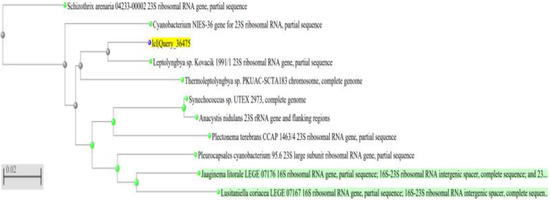 A neighbor-joining phylogenetic tree of Leptolyngbya sp. The sequence of the organism under study is highlighted in yellow. Green highlights reference database sequences.