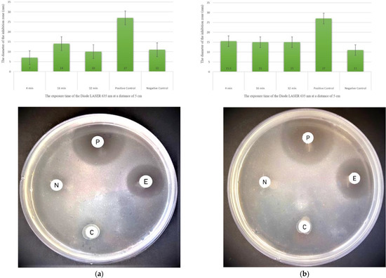 Effect of laser treatment by different exposure times at a distance of 5 cm on Thermoleptolyngbya sp. extracts derived from cyanobacterial biomass pre-exposed to laser and extracts directly exposed to laser against Staphylococcus aureus. (P)—positive control; (N)—negative control; (C)—an extract derived from cyanobacterial biomass pre-exposed to laser; (E)—an extract directly exposed to laser. (a) An agar plate showing the highest inhibition zone of extracts derived from biomass pre-exposed to laser for 16 min. (b) An agar plate showing highest inhibition zone of extracts directly exposed to laser for 4 min.