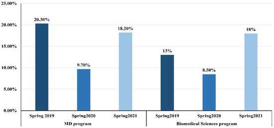 For the theoretical assessment, the score in the spring 2020 semester (89.1 ± 8.6) was significantly higher than those in the spring 2019 (79 ± 16, p < 0.001) and spring 2021 (81.4 ± 14.8, p < 0.001) semesters in both the MD and BMS programs (Table 2). The variation among students’ scores is represented by the CV. The high average score in spring 2020 was accompanied by a reduction in the variation among students’ scores as represented by the CV value of 9.7%, which was lower than the value witnessed in spring 2019 (20.3%). However, the CV increased in spring 2021 to 18.2%, which was closer to the score observed in the spring 2019 semester when the whole course was taught and assessed with the face-to-face method (Figure 1).