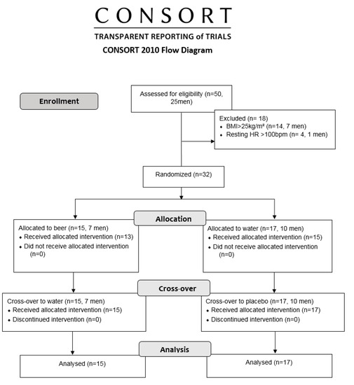 We primarily evaluated a total of 50 (25 men) healthy, physically active according to International Physical Activity Questionnaire (IPAQ), and who socially drink beer (one to two measures-maximum of 5 g alcohol, up to one day per week). We excluded subjects with resting HR > 100 bpm and body mass index (BMI) > 25 kg/m2, musculoskeletal, metabolic, cardiorespiratory and other related disorders under pharmacotherapies, and smokers [19]. We excluded women between the 10th and 15th days and between the 20th and 25th days of their menstrual cycle to avoid the influence of their luteal and follicular phases, respectively [27,28]. The final sample involved 32 subjects split into 17 men and 15 women to eliminate the influence of sex hormones on autonomic responses [29] (Figure 1).