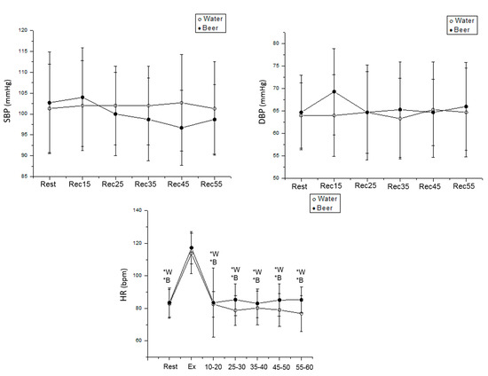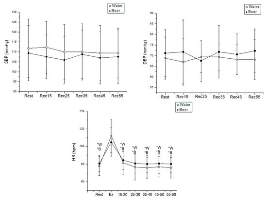 Consistent with our results, no significant change was observed between resting vs. exercise recovery for SBP and DBP when men and women consumed beer or water. This is probably because the subjects performed an exercise intensity (60–65% HRmax) that did not attain the anaerobic threshold [48].