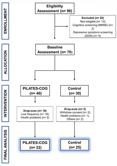 The allocation was made by convenience. Participants had the opportunity to choose to take part in the PILATES-COG group or the control group based on their transport possibilities and personal commitment with the session schedule []. Participants received proper explanations about the research aims, procedures, and periods, and they signed written informed consent before initial assessments. First, all the cognitive followed by physical functional performance assessments were completed on the same day, before and after the intervention period.