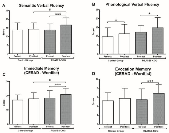 Cognitive Performance. Values presented as mean ± SD. * = p < 0.05; *** = p < 0.001 (Pre × Post Test). # = p < 0.05 (Post × Post Test). CERAD = Consortium to Establish a Registry for Alzheimer’s Disease. (A,B) Verbal Fluency. (C) Immediate Memory. (D) Evocation Memory.