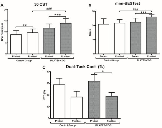 Due to the safeness, adaptability, and promising exercise approach of Pilates for muscle strength, balance, functional mobility, and postural stability in older adults [,,]; because it shows good acceptance and adherence by older adults, especially female patients [,]; and considering that there are no published studies on Pilates in dual task, the main aim of this study was to evaluate the effects of a dual-task intervention based on mat Pilates exercises and multidomain cognitive stimulation on the cognitive and physical-functional performance of postmenopausal older women. Our hypothesis was that a Pilates dual-task intervention would improve memory, balance, lower limb muscle strength, and mobility and reduce the cost of dual-task performance in older women.
