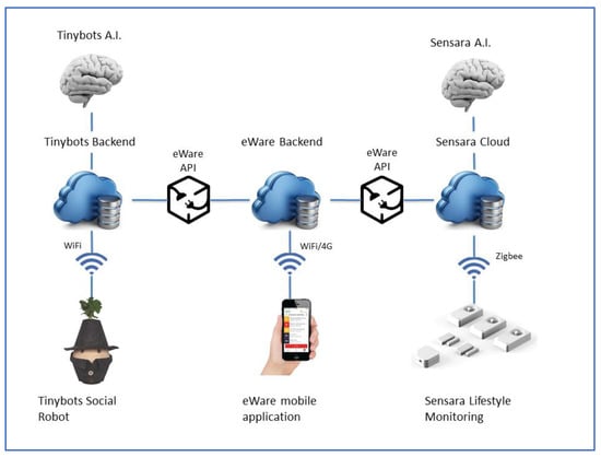 The eWare eco-system is composed of two main technologies: the Sensara, a lifestyle-monitoring technology, and Tinybot, a social robot. The Sensara consists of few motion (PIR) and open/close sensors (5 to 8 depending on the house), that were installed at strategic places in the older adults’ home (e.g., living room, bathroom, kitchen, hallway and front door) and wirelessly connected to a gateway. Data collected by Sensara were uploaded to an analytics engine in the cloud that, after two weeks of acquisition, was able to recognize living patterns of the person at home: at what time the person gets up, how long the bathroom is used, how often the kitchen is used, how long one is out of the house, when the person is taking a nap. Once the behavioral patterns are known, deviations from habitual patterns could be detected. In case of such deviations or downward trends, the system sent a notification to the informal caregiver.