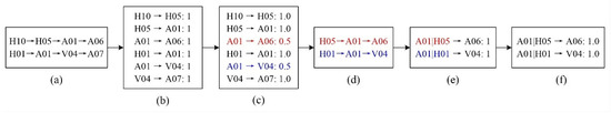 Then, the subpaths of A01→A06 and A01→V04 were extended to and , as shown in Figure 1d. The frequencies of second-order subpaths A01|H05A06 and A01|H01V04 were calculated as 1, as shown in Figure 1e. The transfer probability of second-order subpath was calculated by Formula (2). means the frequency of subpath → coming from .