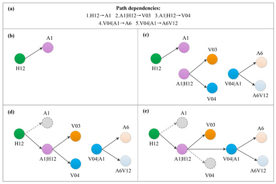 Firstly, the first-order nodes with their corresponding edges were formed by converting first-order path dependency. For example, H12→A1 was converted into H12 and A1 with their edges, as shown in Figure 2b.