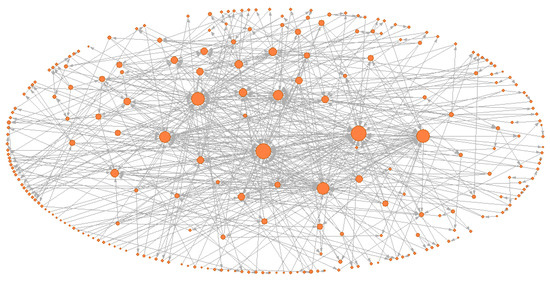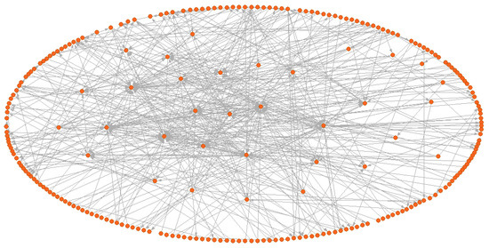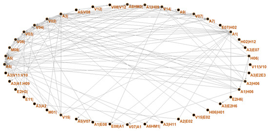 Based on the aforementioned method in Section 2.2, the HMTACN was constructed. The HMTACN consisted of 243 nodes and 545 directed edges. These 243 nodes contain first-order nodes and higher-order nodes. Figure 3 shows the overall topology of the HMTACN by using Pajek. Pajek is software for analyzing and visualizing network structures. There were too many nodes and edges to clarify the detailed information on labels and the corresponding relationships in Figure 3. Therefore, a partial topology of the HMTACN is represented in Figure 4.