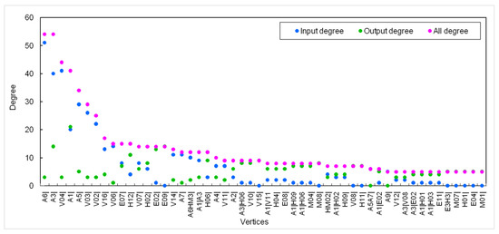 The degree of a node in a network is the number of edges connected to the node. It is the simplest and most important property in a network. The average degree value in the HMTACN was 4.49, indicating that each causal factor connected to four or five factors on average. For directed networks, degree can be classified as input, output, and total degrees. A node with a greater input degree is more affected by other nodes; a node with a greater output degree is more likely to affect others. As there were 243 nodes in the HMTACN, it was necessary to focus on the higher-degree nodes. Therefore, Figure 5 only illustrates the nodes whose degrees were more than five.