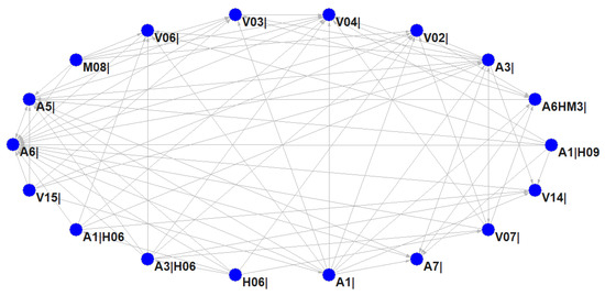 In Figure 4, we can see 21 first-order nodes, such as A1|, A3|, V12|, V14|, A6HM1|, and E2H3|, and 24 higher-order nodes, such as H02|H12, V08|V12, A3|E2E3, and A3|V11.V10. Different higher-order nodes may represent how different path dependencies point to the same node, such as A3|E2E3 and A3|V11.V10. A3|E2E3 reflects a continuous interaction from E2E3 to A3. A3|V11.V10 illustrates A3 is directed from V11, and V11 is directed from V10. To reveal the characteristics of HMTACN, topology properties were analyzed as described below.
