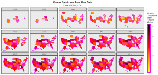 Map-graph of raw Down syndrome rates across USA 1987–2014.
