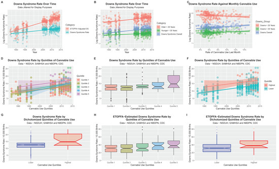 Down Syndrome Univariate analysis. (A) DS rate over time for both raw rates and ETOPFA-corrected estimates. (B) DS rates over time by maternal age group. (C) DS rates as a function of cannabis use. (D) DS rates over time by cannabis use quintiles. (E) Boxplot of DS rates by cannabis use quintiles. (F) DS Rates over time by dichotomized quintiles. Quintiles 1–4 have been collapsed into the “Lower category”. The highest quintile is Quintile 5. (G) Boxplot of dichotomized cannabis use quintiles. (H) Boxplot of cannabis use quintiles of ETOPFA-corrected DS estimates. (I) Boxplot of dichotomized cannabis use quintiles for ETOPFA-corrected DS Rates. Note that non-overlapping notches signifies statistical significance.