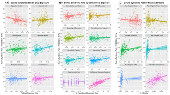 We therefore formed three related hypotheses prior to commencing our study. The first was that a demographic survey of drug use would be highly correlated with DS rates (DSR) across the USA after controlling for common covariates such as ethnicity, median household income and maternal age. Our second hypothesis was that cannabis use or cannabinoid exposure would be positively correlated with DSR epidemiologically across both space and time. The third hypothesis was that the various legal paradigms relating to cannabis may be significantly related to the DSR.