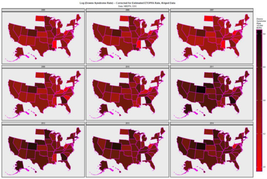 Log of ETOPFA-corrected Down syndrome rates across USA 2005–2014, kriged data.