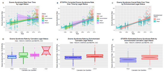 It was also of interest to see if the legal status of cannabis might be associated with the DSR. This is illustrated in Figure 5 where the four legal statuses are charted over time in panel A, the ETOPFA-corrected DSR is charted over time in panel B, the dichotomized legal status is charted against the DSR in Panel C, as boxplots in panel D, dichotomized boxplots in panel E and dichotomized boxplots for the ETOPFA-corrected estimates in panel F. In each case apparently highly significant changes are shown.