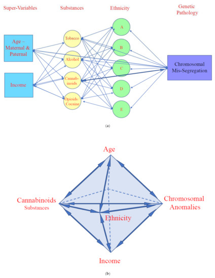 Mechanistically these changes may be summarized in the following Figure 6 which presents a Directed Acyclic Graph (DAG) of the various covariates studied. Figure 6a shows four domains namely, Supervariables, Substances, Ethnicity and Genomic pathology. Age is a well recognized super-variable as chromosomal and genetic disorders become more common for many reasons with age. Income is also involved as it affects access to substances and lifestyle factors. All the substances are implicated in genotoxic outcomes, most particularly cannabinoids. A strong link is therefore shown between cannabis and genotoxic outcomes. Ethnicity is also implicated but regression studies show that its effect is largely accounted for by cannabinoid exposure by ethnicity as its effect disappears after adjustment. These various domains are joined by two headed arrows indicating largely two way effects throughout.