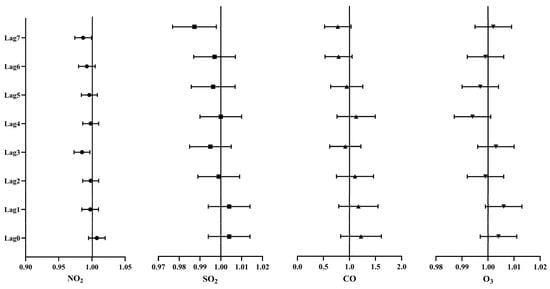 Percentage change with 95% CI of daily hospitalizations for ischemic stroke with 10 μg/m3 or 10 mg/m3 (mg/m3 for only CO) increase in gaseous pollutant concentration in single-day lag analysis in Tianjin (2013–2016).