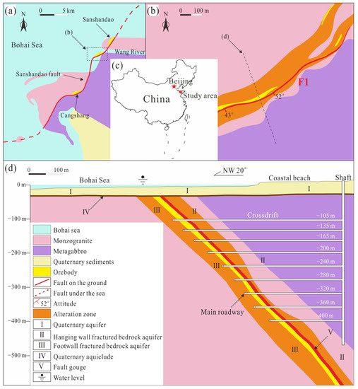- Zhao, H.; Ma, F.; Li, G.; Zhang, Y.; Guo, J. Study of the hydrogeological characteristics and permeability of the Xinli Seabed Gold Mine in Laizhou Bay, Jiaodong Peninsula, China. Environ. Earth Sci. 2012, 65, 2003–2014. [Google Scholar] [CrossRef]