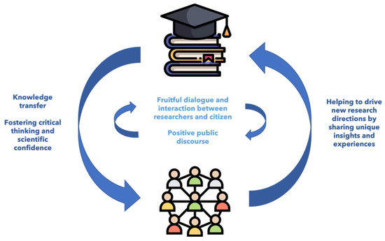 Public engagement and involvement programs, which are an important part of third mission activities, ensure knowledge transfer, help to inspire positive public discourse, and encourage interaction between researchers and citizens. These interventions can help to instill curiosity about science in citizens and foster scientific literacy, critical thinking, and scientific confidence. On the other hand, the public can help to drive new research questions by sharing precious insights and experiences (see Figure 1).