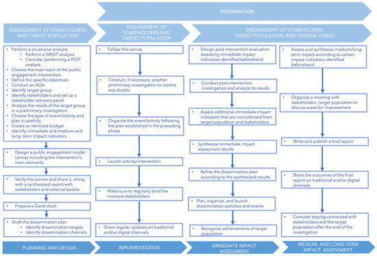 To be effective and tailored to the respective target population, third mission activities should follow systematic approaches. Although several general methods for strategic project planning and management exist, up to now, too little attention has been paid to the design of comprehensive techniques for the development of public engagement interventions. Therefore, we aimed to propose a detailed, structured framework for academic institutions planning to implement public engagement interventions; to suggest potential indicators to measure its immediate-, medium-, and long-term impact; and to outline methods for dissemination.