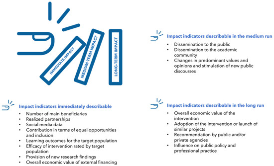 Medium-term impact indicators include the dissemination of findings to the public (e.g., number of dissemination events and webinars and number of participants, newspaper articles, and radio shows) and the academic community (e.g., number of publications in national and international peer-reviewed journals, number of citations, and number of downloads of the publications). Finally, there are indicators that are usually only describable in the long run (e.g., the adoption of the public engagement intervention by other universities, educational institutions, public and/or charity organizations, and the influence of new public policies). Obviously, the different categories (i.e., immediate-, medium-, and long-term) cannot always be strictly separated and smooth transitions are possible. For instance, in some cases, the overall economic value of external financing might be determinable only in the medium- or long-term and not immediately after the completion of the intervention.