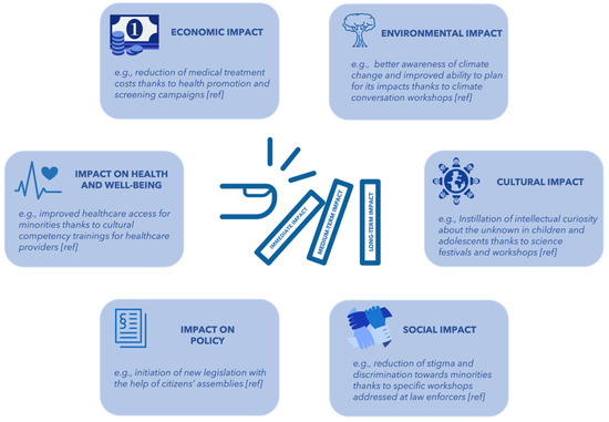The Impact of the public engagement intervention can be described not only in terms of time but also in terms of affected areas. As defined by the Higher Education Funding Council for England, an impact is “an effect on, change or benefit to the economy, society, culture, public policy or services, health, the environment or quality of life beyond academia” [57] (p. 28). Figure 4 portrays these areas of positive impacts of public engagement interventions and offers examples of each area. While economic impacts, impacts on health and well-being, impacts on policy, and environmental impacts are rather self-explanatory, cultural impacts and social impacts are more difficult to describe. Although seemingly like cultural impacts (i.e., changes in predominant values, opinions, and behavior patterns benefitting organizations, social groups, or society in general [57]), social impacts regard any changes that improve social injustices and overcome related barriers [66,67].