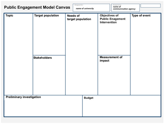 The main elements of the proposed intervention that are discussed in the planning and design phase (i.e., topic, target population, stakeholders, needs of the target population, objectives of public engagement intervention, type of event, preliminary investigation, budget, and measurement of impacts) can be gradually inserted into the so-called Public Engagement Canvas. Subdivided into several quadrants, the canvas helps in the creative development and realization of public engagement activities by providing a comprehensive and visual overview (Figure 5).