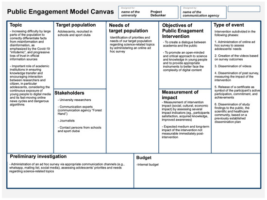 Following the proposed framework, we prepared a Public Engagement Model Canvas to easily visualize the main elements of Debunker (see Figure 6). However, it represents only a first, preliminary version since, as stated above, we have not yet assessed the needs of the target group.