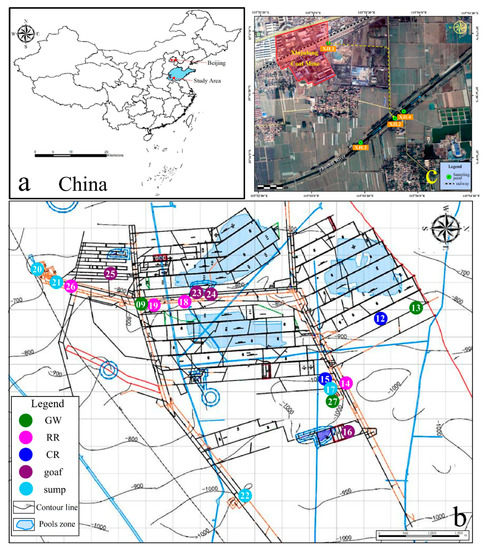 Locations of sampling sites in Xinjulong coal mine and mine-water-discharged Zhushui River in Shandong Province, China. Xinjulong coal mine is located in Shandong Province, China (a). Sampling sites included 17 underground sites (b) and 4 surface water sites (c). Note: The number in image b (XJL is omitted) represents the sample point name, and detailed sampling place is shown in Table S1. GW, RR, CR, goaf, sump, and SW refer to groundwater aquifers (XJL9, XJL13, XJL27), rock roadways (XJL14, XJL18, XJL19, XJL26), coal roadways (XJL12, XJL15), goafs (XJL16, XJL23, XJL24, XJL25), water sumps (XJL17, XJL20, XJL21, XJL22), and surface waters (XJL1, XJL2, XJL3, XJL4), respectively. The blue and yellow arrows refer to the flow direction of the river and the mine drainage, respectively.