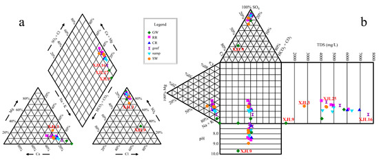 Piper (a) and durov (b) diagrams of the water samples. The points with same colors and shapes represent water samples from the same zones. Note: GW, RR, CR, goaf, sump, and SW refer to groundwater aquifers, rock roadways, coal roadways, goafs, water sumps, and surface waters, respectively.