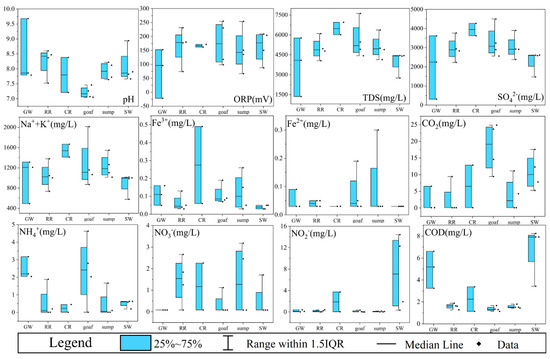 Hydrochemical components of water samples have been plotted as half-box-and whisker diagrams, based on their locations in different zones, to compare hydrochemical variation among these zones (Figure 4 and Supplemental Figure S3). Based on the median value, the pH values of goafs were the lowest (7.1–7.5), followed by those of coal roadways, groundwater aquifers, surface waters, and water sumps, and the pH values of the rock roadways were the highest (7.5–8.6). The calcium or limestone of coal seam floor and concrete possibly increased the alkalinity of the rock roadway (Figure 4). The TDS of mine water ranged from 4.14 to 7.61 g/L, and the TDS of coal roadways was obviously higher than that of other zones. The most contributions to TDS were SO42− and Na++K+, in which the SO42− (3.6–4.3 g/L) and Na++K+ (1.4–1.7 g/L) concentrations of the coal roadways were the highest, followed by the SO42− (2.6–4.5 g/L) and Na++K+ (0.9–2.0 g/L) of the goafs. Combined with higher Fe3+ (ND–0.5 mg/L) and Fe2+ (ND–0.2 mg/L) in the coal roadway and goafs, it was inferred that pyrite in the coal could be oxidized to generate a large amount of sulfuric acid and iron hydroxide (Equations (S1)–(S3)). Compared with coal roadways, the SO42− concentration (4.5 g/L) of goaf closure in 2021 (newly closure, XJL16) was higher, and the pH value (7.3) was lower, but the SO42− concentration decreased gradually with the time since goaf closure (2.6 g/L of goaf closure in 2009, XJL25). This interesting phenomenon is discussed in detail in Section 3.4.