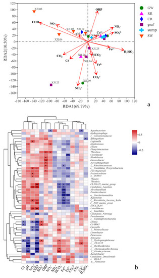 The RDA and heatmap were used to explore the relationship between microbial community and environment variables and evaluate the potential impacts on the microbial community. After deleting 5 collinearity variables, due to the chemical similarity (i.e., ORP and DO), high correlation with each other (i.e., Mg2+, Ca2+ and Sr, Na++K+ and SO42−), and combination of multiple variables (i.e., TDS), 15 hydrochemical components remained to RDA and heatmap analysis. The RDA results showed that the top two axes accounted for 80% of total cumulative variance, and environmental factors had different proportions that are responsible for the variance on water samples microbial community (Figure 6a and Supplemental Table S4). COD (r2 = 0.44, p < 0.05) and NH4+ (r2 = 0.39, p < 0.05) were significantly correlated with microbial communities. In particular, COD was positively correlated with the microbial communities of surface waters, while NH4+ (negatively correlated with ORP) was positively correlated with the microbial communities of goafs, rock roadways with lower ORP, and Ordovician limestone groundwater. The goaf points (i.e., XJL16: closure in 2021; XJL23: closure in 2010; XJL24: closure in 2012; XJL25: closure in 2009) were the most scattered and were strongly correlated with NH4+, NO3−, SO42−, Fe2+, and Fe3+, suggesting the microbial community structures of the goafs closure in different times were quite different. The rest points of water sumps, rock roadways, coal roadways, and groundwater aquifers were relatively clustered, mainly distributed in the first quadrant, and positively correlated with SO42−, NO3−, and ORP. Hence, the microbial communities mainly corresponded to the levels of these redox sensitive indices of the water samples in coal mines.