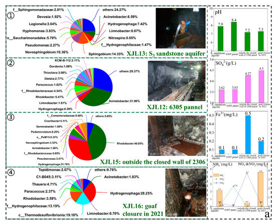 Coal mining is mainly carried out on the tunneling panel of the coal roadway. During the tunneling process, S3 sandstone groundwater would flow out from the roof and floor of the coal roadway, resulting in a new water–coal/rock reaction. After the panel mining was finished, a closed wall was built to close the goaf. Therefore, we selected ① S3 sandstone groundwater, ② 6305 panel, ③ outside the closed wall of 2306 panel, and ④ goaf closure in 2021 (newly closure) as the representative pathway to research the variation rule of microbial community in mine water during coal mining. As shown in Figure 7a, the hydrochemical compositions and microbial communities changed significantly during coal mining. With the advancement of coal mining, the pH value first increased and then decreased, with the highest in the 6305 panel (8.4) and the lowest in the goaf closure in 2021 (7.1); SO42− gradually increased (3.6–4.5 g/L); Fe2+ increased first and then decreased; NH4+ decreased first and then increased, while NO3− and NO2− did the opposite.
