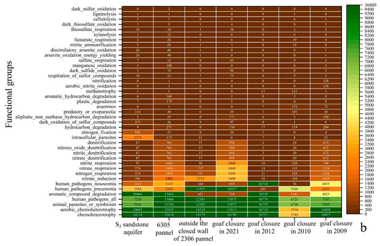 The microbial community richness and diversity of the four sites followed the order of 6305 panel > S3 sandstone groundwater > goaf closure in 2021 > outside the closed wall of 2306 panel (Supplemental Table S2). Compared with S3 sandstone groundwater, the relative abundance of Thioclava that could oxidize low-valence-reducing sulfides into SO42−, Acinetobacter, Dietzia, Paracoccus, and Limnobacter, which could degrade PAHs and other organic compounds, increased significantly in 6305 panel. The FAPROTAX prediction also showed that the function of dark sulfide oxidation, dark thiosulfate oxidation, manganese oxidation, hydrocarbon degradation, plastic degradation, and aromatic hydrocarbon degradation were the highest in the 6305 panel (Figure 7b). These results confirmed that, on the tunneling panel, pyrite could be oxidized by sulfur-oxidizing bacteria, leading to the increase of SO42− concentration, and the organic matter in coal provided abundant carbon source for microorganisms. Meanwhile, higher functions of human pathogens in coal roadways and goafs (Figure 7b) may have resulted from more human mining activities in these zones.