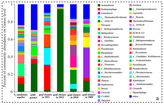 In addition, compared with other zones (i.e., rock roadways, coal roadways, water sumps, and surface waters), the bacteria with sulfate reduction function (i.e., c_Thermodesulfovibrionia) and sulfite reduction function (i.e., Thermodesulfitimonas) in goafs have relatively higher proportions (Figure 8a). The FAPROTAX prediction also suggested that the function of respiration of sulfur compounds, sulfate respiration, and anammox were higher in goafs (Figure 7b). Therefore, with the time since the cessation of mining, the goafs environment was gradually closed, oxygen was gradually consumed (Supplemental Table S1), and then the desulfurication of SRB occurred in a long-term high SO42− environment. Acinetobacter, o_Burkholderiales, Limnobacter, Cavicella, Paracoccus, and Dietzia, which could degrade hydrocarbon and may generate CO2, were detected in different goafs, leading to the increase of free CO2 concentration (9.4–24.8 mg/L). It is worth noting that, with the time since goaf closure, more unclassified and rarely reported bacteria were detected. These bacteria may adapt to the environment of oligotrophic and higher heavy metals. The long-term evolution characteristics of hydrochemistry and microbial communities in goaf need to be studied through longer in-situ monitoring and laboratory simulation experiments, which would help predict the potential for natural attenuation and build underground reservoirs in goafs.