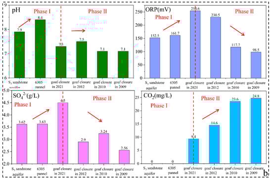 - Coal roadways and goafs were the critical zones of groundwater pollution prevention and control. During tunneling in the panel, pyrite could be oxidized by sulfur-oxidizing bacteria, leading to SO42− increase. With the closure of the panel and the formation of the goaf, the SO42− concentration increased rapidly for a short period. However, with the time since goaf closure, the proportion of SRB increased significantly, leading to SO42− concentration’s decrease by 42% over 12 years, which indicated that long-term closed goafs had a certain self-purification ability.