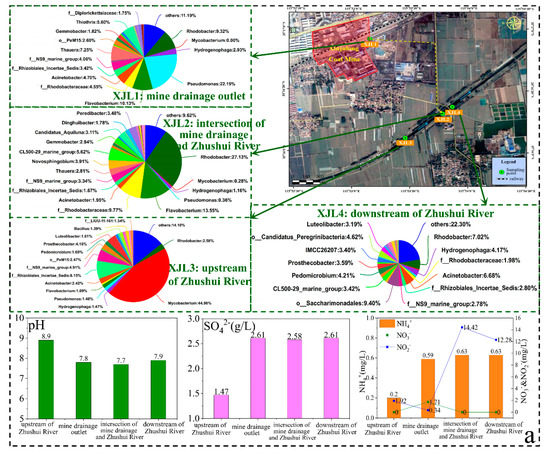 In order to ensure safe production from the Xinjulong coal mine, the mine water was discharged into the nearby Zhushui River after treatment both underground and on the ground. The mine drainage outlet and Zhushui River were sampled to study the environmental effect of mine drainage on surface rivers (Figure 9). The conventional hydrochemical compositions concentration (i.e., TDS, K++Na+, Ca2+, SO42−, and Sr) of the mine drainage outlet (XJL1), the intersection of mine drainage and Zhushui River (XJL2), and downstream (XJL4) of Zhushui River were similar, which were significantly higher than those of the river upstream (XJL3). According to the calculation results, based on the 2H and 18O isotopes, the mine drainage accounted for 59–77% of the downstream flow, with the details described in the Supplementary Materials [42]. From the upstream to the downstream of Zhushui River, DO concentration first decreased and then increased (from 7.35 to 2.62 and then 3.58 mg/L), which was consistent with the larger proportion of aerobic Mycobacterium (44.98%) and f_Rhizobiales_Incertae_Sedis (8.15%) in XJL3.