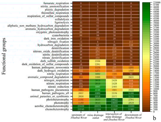 Effects of mine drainage on microbial community and hydrochemical composition in the surface river (a); FAPROTAX function prediction result of surface waters (b).
