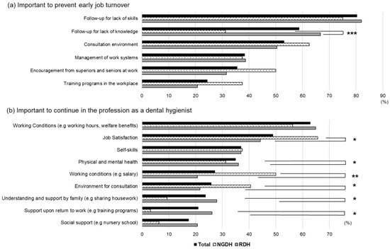 (a) Important items to prevent early job turnover, and (b) important items to continue in the profession as a dental hygienist. NGDH: new graduate dental hygienists, RDH: reinstated dental hygienists. * p < 0.05, ** p < 0.01, *** p < 0.001.