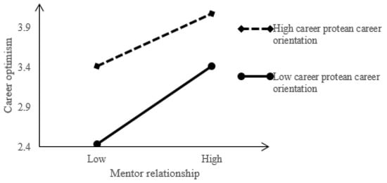 Protean career orientation is an important factor that affects employees’ career development and work life. Individuals with higher career optimism are able to adapt to the changing professional environment []. Individuals with a highly protean career orientation tend to set clear career goals, make detailed career plans, and choose careers according to their own values. A career that is consistent with their values is more likely to make them feel successful. Individuals with a highly protean career orientation subjectively seek self-development. As a supplement to external resources, the mentoring relationship has little influence []. However, individuals with low protean career orientation find it difficult to face the changing economic environment because of their passive adaptation to the environment, and their career development path is unclear. The multiple functions of the mentoring relationship provide a better supplement for clarifying the career development path. Therefore, for individuals with low career orientation, the mentoring relationship can help protégés reduce frustration, improve their success rate and productivity, enhance their job satisfaction and overall life happiness, and increase their work engagement and loyalty. The mentor can help the protégé develop their professional knowledge, stimulate their potential interest in a certain subject, provide them with appropriate challenges, and guide them to develop their own interests and lifelong careers.