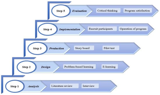This study followed the Network-Based Instructional System Design model to develop the educational program []. The model comprises five steps: analysis, design, production, implementation, and evaluation (Figure 1).