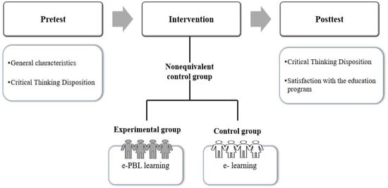 A nonequivalent control group pretest–post-test design was used (Figure 2). We compared the effects among South Korean NH staff who had taken part in the e-PBL-based educational program and those who were not exposed to the program. The control group was exposed to e-learning without PBL strategy to prevent any possible threats to the internal validity of the experiment and to identify the PBL-specific outcome effects.