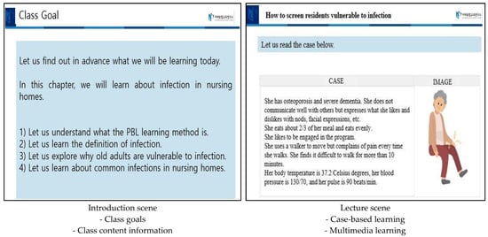 In Step 1, the characteristics of the learners and the educational contents were identified by analyzing learners’ needs and conducting a literature review. To analyze learners’ needs, in-depth interviews were conducted with nine practitioners in NHs. The average age of the participants was 48.25 ± 11.76 years. All of the participants had used the e-learning training program before. Each individual’s work experience was varied, with an average of 5.44 ± 2.50 years. Eight registered nurses and one nurse assistant participated in the interviews, which lasted 60 min. Semi-structured questions regarding infection control education goals and contents, educational media, and training time were used. The findings of the in-depth interview are as follows. The goals and contents in NHs focus on early detection and prevention rather than on the treatment of infections. Furthermore, e-learning has been confirmed as a suitable educational medium due to the nature of the intervention during the COVID-19 pandemic and the nursing staff’s workloads. Regarding training time, it was decided that 2–3 h was an appropriate duration. The literature review showed that PBL is a suitable educational method for improving nurses’ judgment for early detection and prevention of infection []. The practical reasoning process in recognizing and dealing with new infectious cases could be improved by an educational strategy focused on problem-solving []. Moreover, as e-learning improves learning ability through self-directed learning and repetition [], the program’s educational effect was enhanced through e-PBL, which combines the advantages of PBL and e-learning []. The e-learning technology and environment necessary for this study were considered during the program’s development process through discussions between two computer education experts and two doctors in nursing.