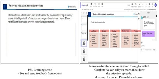 Web-based education has become commonplace in various educational fields, especially after the COVID-19 pandemic [,]. Furthermore, e-learning has been shown to better improve individuals’ knowledge and skills compared with traditional learning []. Although e-learning has a weakness, in that it makes learners passive participants through lecture-dominant teaching, PBL is an active educational method that is learner-centered during the learning process, and it promotes critical thinking and self-directed learning [,,]. In particular, e-PBL, which combines web-based instruction and PBL, provides a self-directed learning environment for learners to actively solve problems without time and space constraints. This educational method can foster reflective attitudes and critical thinking []. The difference between the web-based education of the educational program developed in this study is that learner–learner interactions (e.g., sharing ideas and recommendations) and teacher–learner interactions are made possible via chatbots. However, to enhance the program’s accessibility, it will be necessary to adapt it to a mobile device environment.