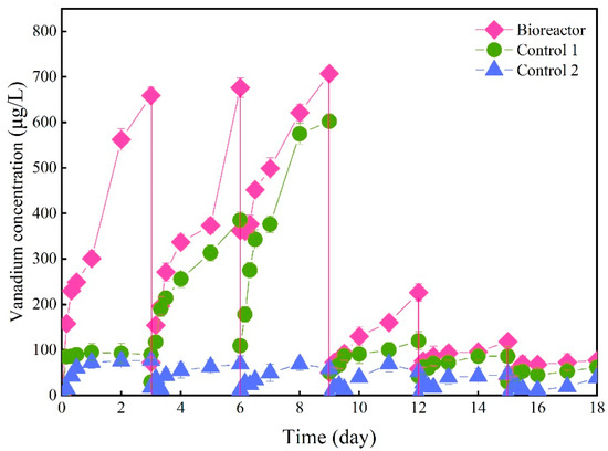 The variations of bioleaching vanadium concentrations in different reactors were measured along six consecutive cycles (Figure 2). For Bioreactor, the vanadium concentration gradually increased with the leaching process in each cycle, with a higher concentration in Bioreactor than in Control 1 and Control 2. The vanadium leaching concentrations reached 659 μg/L, 676 μg/L and 707 μg/L, respectively, in the Bioreactor during the first three cycles. Some studies reported that heterotrophic microorganisms synthesize organic acids (citric, oxalic, gluconic etc.) as metabolic by-products during their cellular metabolism. The acidity generated by the produced organic metabolites and metal-chelating properties of organic compounds were responsible for the solubilization of metal from minerals [34,35]. After the third cycle, the leaching concentration of vanadium rapidly dropped in Bioreactor, which demonstrated the depletion of vanadium in stone coal. In addition, the vanadium concentration increased significantly in Control 1 after the first cycle, with the highest vanadium concentration reaching 602 μg/L in the third cycle. A possible explanation is that without the addition of a carbon source, the bacteria consumed the organics in the stone coal to sustain their bacterial growth, thus disrupting the stone-coal structure and significantly promoting vanadium leaching. Comparably, the leaching concentration of vanadium in each cycle of Control 2 was relatively low, with the highest concentration being up to 76.6 μg/L. The recovery of vanadium in Bioreactor, Control 1 and Control 2 were 5.43%, 2.96% and 0.75%, respectively. Similar results of low recovery efficiency were also obtained in the experiment of vanadium bioleaching from basalt [36]. Under the condition of a sufficient carbon source, the recovery of vanadium in Bioreactor was increased by 1.83 times and 7.24 times compared to Control 1 and Control 2, respectively, further demonstrating the important roles of bacteria in the bioleaching process.