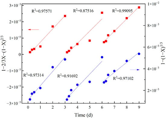 where k was the rate constant, t was the reaction time and X was the metal recovery efficiency. The chemical-reaction-controlled leaching process can be expressed using the following equation:
