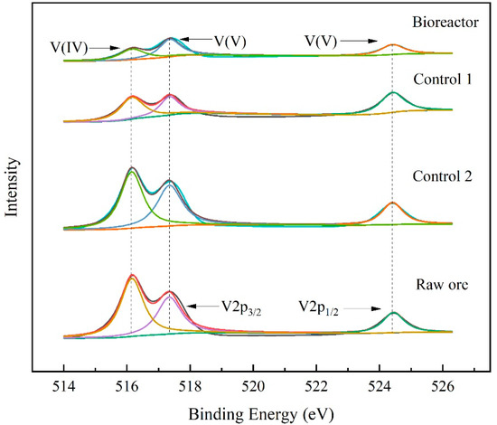 The stone coal surface before and after leaching was investigated by XPS (Figure 5). In general, the binding energy of V2p3/2 and V2p1/2 electrons was used to reflect the valence state of vanadium [40]. The electron-binding energies of V2p3/2 and V2p1/2 corresponding to V(V) were located at 517.42 eV and 524.44 eV, respectively, while the sub-band situated at 516.17 eV was identified to be V(IV) [41,42]. There is no special symmetrical peak in each spectrum, indicating that the peaks were formed by the superposition of different valence states of the vanadium element, and that the vanadium in the stone coal mainly existed in the form of V(IV) and V(V). According to the peak height, the contents of V(IV) and V(V) in Bioreactor and Control 1 were lower than that of the raw mineral ore, suggesting that a fraction of vanadium was already leached from stone coal and transferred into the solution. Weaker spectrum peaks of V(V) were obtained in Bioreactor than that in Control 1, suggesting a better leaching effect for Bioreactor, wherein heterotrophic microorganisms use an adequate carbon source to synthesize organic acids for vanadium bioleaching.