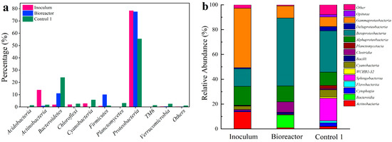 At the end of experiments, the microorganisms attached to the surfaces of the stone coal in Bioreactor and Control 1 were collected. Then, DNA extraction and 16S rRNA gene sequencing were performed on the collected microbial samples together with inoculum. Total genomic DNA was extracted from samples using Fast DNA SPIN Kit for Soil (MP Biomedicals, Santa Ana, CA, USA) according to the manufacturer’s instructions. DNA was amplified by PCR (GeneAmp® 9700, ABI, Waltham, MA, USA) using primers 338F (ACTCCTACGGGAGGCAGCAG) and 806R (GGACTACHVGGGTWTCTAAT). Purified PCR products were quantified using a QuantiFluorTM-ST microfluorometer (Promega, Madison, WI, USA). After being purified and quantified, a mixture of amplicons was used for high-throughput 16S rRNA gene sequencing on MiSeq (Illumina, San Diego, CA, USA). The resulting data were processed, and microbial communities were analyzed, as previously described [32,33].