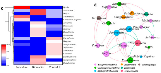 The key microorganisms at the genus level were further investigated (Figure 6c). Compared with inoculum, the relative abundance of Acidovorax (23.05%), Delftia (19.25%) and Pseudomonas (6.41%) were greater in the Bioreactor. Acidovorax are iron-oxidizing bacteria, which can destroy the structure of stone coal through iron oxidation and thereby promote metal leaching [43]. Moreover, Delftia reportedly exhibited the ability to oxidize vanadium (IV) or vanadium (III) in stone coal with positive oxidase secretion [44]. Pseudomonas was reported to be resistant to vanadium and can produce hydrogen cyanide for metal leaching [40,45]. In Control 1, autotrophic sulfur-oxidizing bacteria, Sulfuritalea, enriched (2.80%) due to the lack of carbon source. A previous study reported the mechanisms involved in the microbial metal leaching of sulfide minerals. Sulfuritalea oxidized metal sulfides to gain electrons directly from minerals [46].