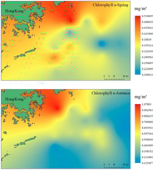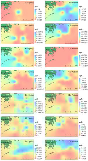Figure 2. As the concentrations of As and Cd in spring seawater samples were not detected much from the concentrations of Cr and Cd in autumn seawater samples, the interpolation results may have some errors. In general, the concentration of heavy metals in the coastal waters of Hong Kong has a seasonal trend, with the concentration of Cu in spring higher than in autumn, but for Pb and Cr, the concentration in autumn is higher than in spring, mainly due to the uneven distribution of seawater temperature caused by the seasonal monsoons in Hong Kong [